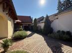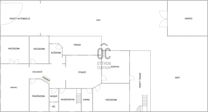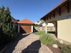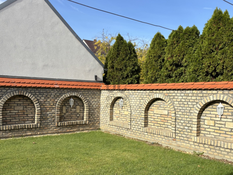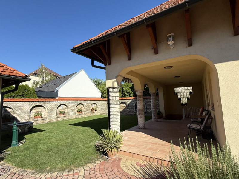 A gondozott kertben fedett autóbeálló és garázs (külön-külön egy autó számára), pázsitos udvar, díszkert, hangulatvilágítás, kerti csap, bográcsozó, és a kikapcsolódáshoz két fedett terasz került kialakításra.